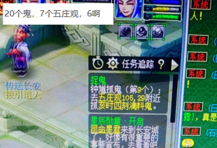在梦幻西游中各位玩家刷任务时的效率能否比较快?另外一方面的影响因素就是自身的运气,如果各位玩家在任务的过程中经常领到那些路途比较短,战斗难度比较简单的任务,那样的任务效率就会比较快,像上面这位玩家的这种情况的任务效率就不快,因为上面这位玩家在进行抓鬼任务的时候,20个抓鬼任务中有7次都是需要去五庄观的,跑路的时间特别长。这就是系统的一个阳谋了,逼着各位玩家去换境外合成旗呢。