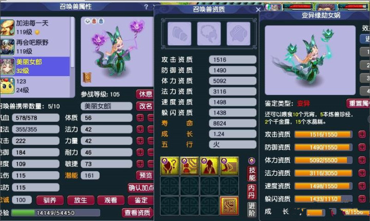 上面这位玩家现在弄了这么一只变异的缘劫女娲,这只缘劫女娲的资质是非常好的。现在这只召唤兽被打造成了一只单法的抗法的血盾,而且这只召唤兽还是4赐福的,拥有的赐福技能就是敏捷、神迹、法术抵抗合冥思,升级为超级法术抵抗以后,这只召唤兽就相当于是拥有了单体罗汉金钟的效果。所以上面的这只召唤兽进入战斗后的抗法能力是特别强的,比较克制那些法系门派比较多的队伍。